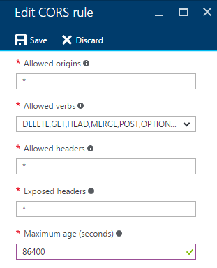 Cross-origin resource sharing, or CORS, must be configured on the Azure Storage account to be accessed directly from JavaScript in the browser. You are able to set the CORS rules for specific Azure Storage account on the Azure Portal. The "Allowed origins" could be set to "*" to allow all the origins in this sample. For more information about CORS, see Cross-Origin Resource Sharing (CORS).