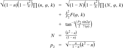 These two functions evaluate the incomplete elliptic integral of the third kind Π(n, φ, k) and its complete counterpart Π(n, k) = E(n, π/2, k).