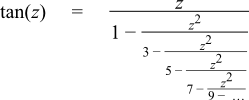Notice that if the continuant is subtracted from the b terms, as is the case here, then all the a terms returned by the generator will be negative. The tangent function can now be evaluated using: