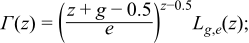 Finally note that the Lanczos approximation can be written as follows by removing a factor of exp(g) from the denominator, and then dividing all the coefficients by exp(g):