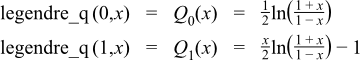 template <class T> calculated-result-type legendre_q(unsigned n, T x); template <class T, class Policy> calculated-result-type legendre_q(unsigned n, T x, const Policy&);