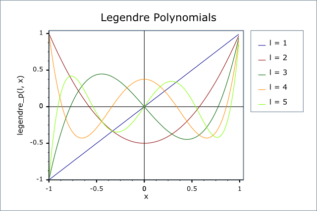 The following graph illustrates the behaviour of the first few Legendre Polynomials: