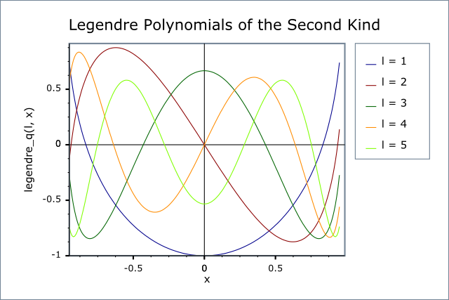 Returns the value of the Legendre polynomial that is the second solution to the Legendre differential equation, for example: