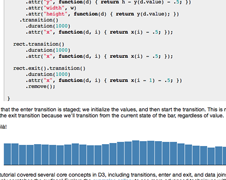A continuation of the above introductory tutorial, this guide covers more exciting dynamic aspects of D3, including transitions and data joins. Learn how to create realtime visualizations and specify enter and exit animations.