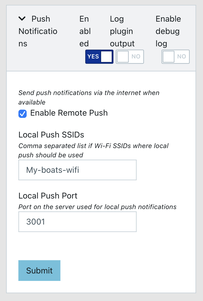 • Local Push SSIDs: Enter the SSID(s) of the WiFi network(s) on your boat which the devices that are to receive notifications are connected.