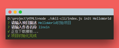 其实到这里,已经可以执行 init 命令了。我们来测试一下,在 okii-cli 的同级目录下执行: