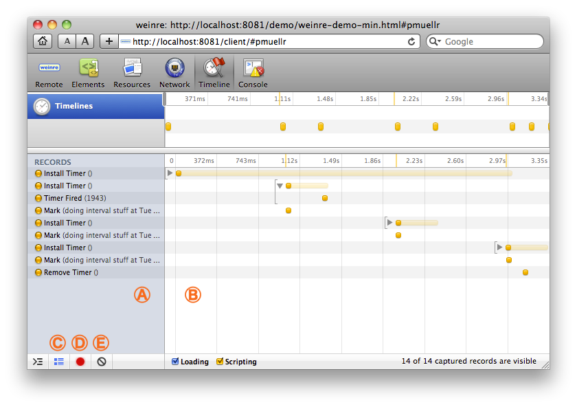 The Timeline panel is used to show events that are occurring in the target. Currently only two types of events are shown: timers/intervals, and user-specified events. Use console.markTimeline("A Label") to add a user-specified event to the timeline with the specified label.